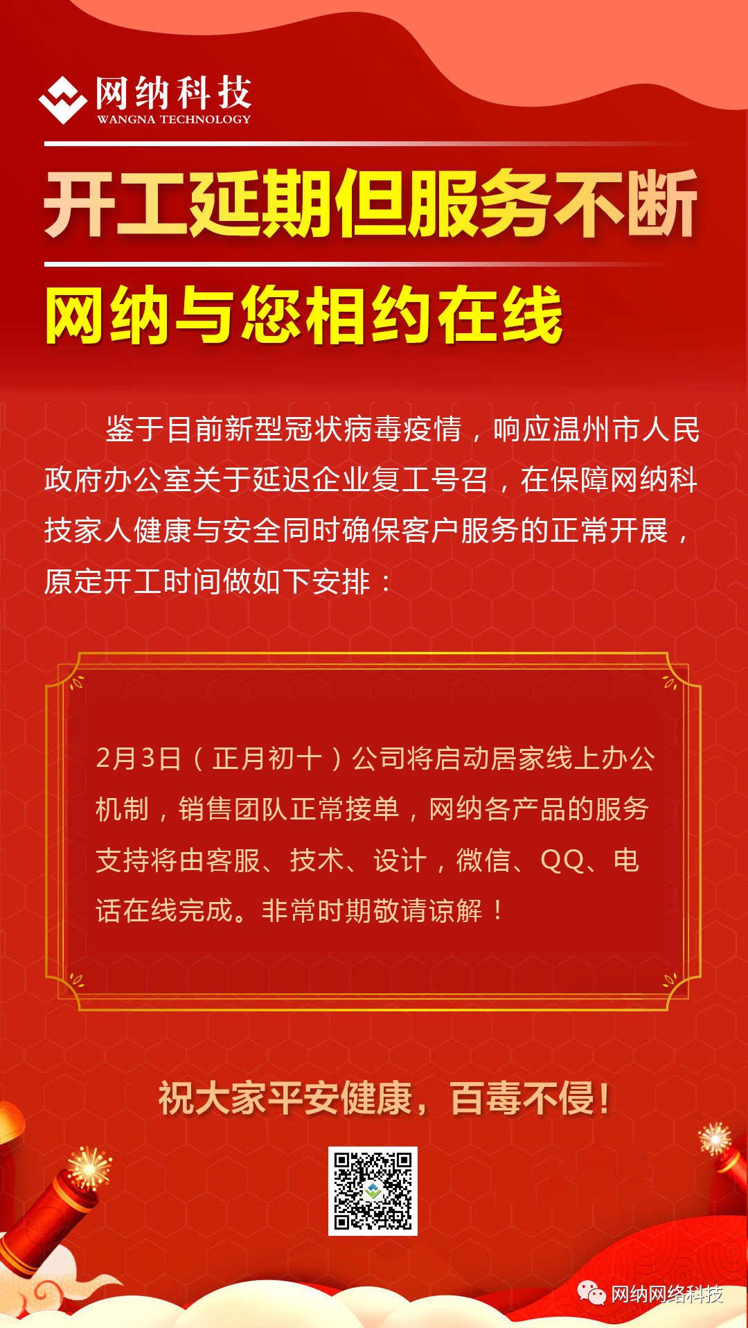 鑒于目前新型冠狀病毒疫情,響應溫州市(shì)人(rén)民(mín)✔∏政府辦公室關于延遲企業(yè)複工(gōng)号召,在保障網納家(ji≤ ¥ā)人(rén)健康與安全同時(shí)确保客戶服務的(de)正常開(kāi)展,原定開(λ®λkāi)工(gōng)時(shí)間(jiān)做(zuò)如(rú)下(xià)安排: