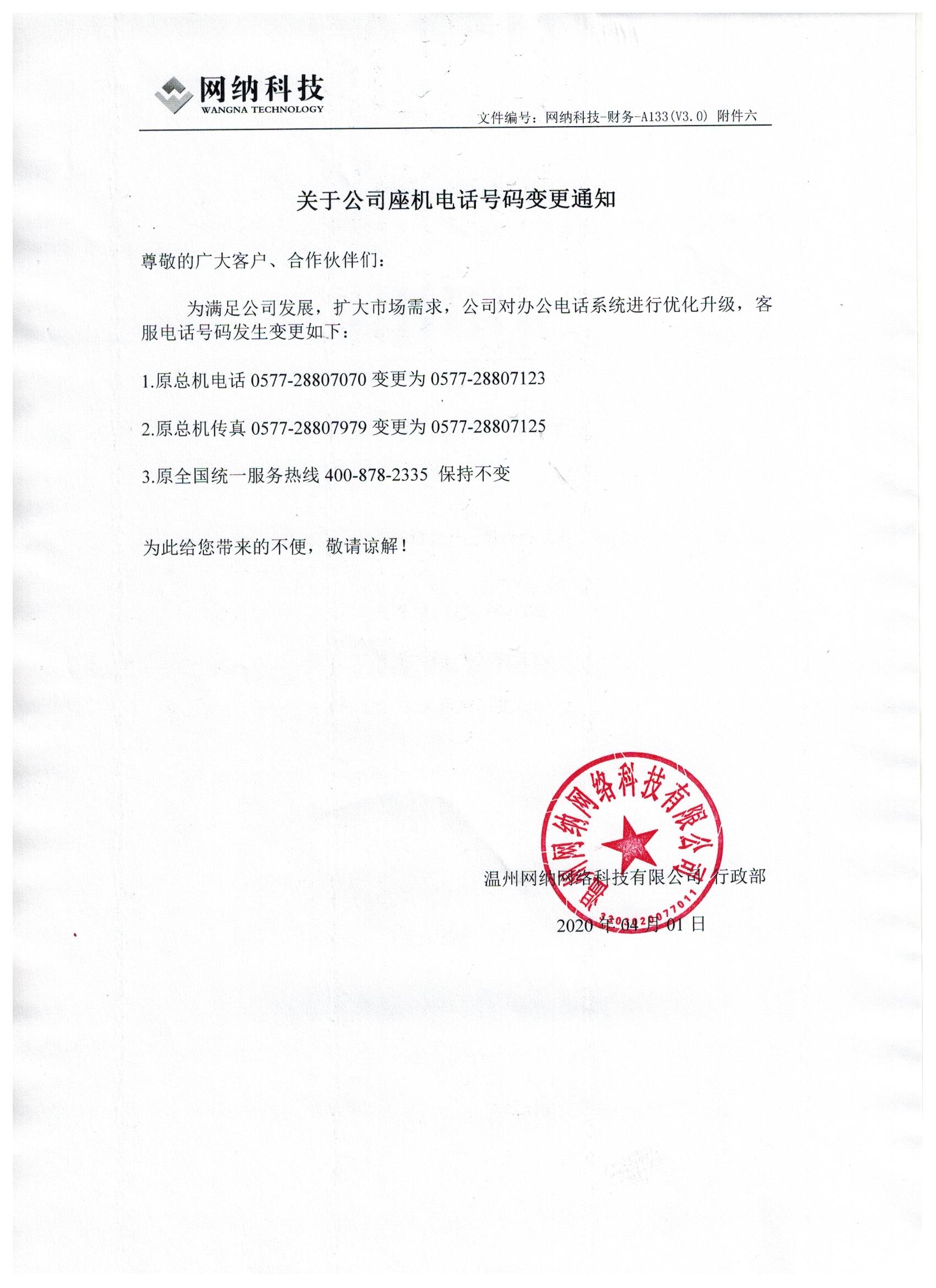 1.原總機(jī)電(diàn)話(huà)0577-28807070變更為(wèi)0577©>σ-28807123